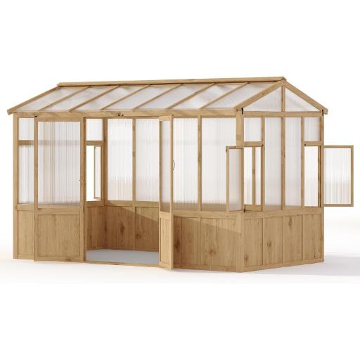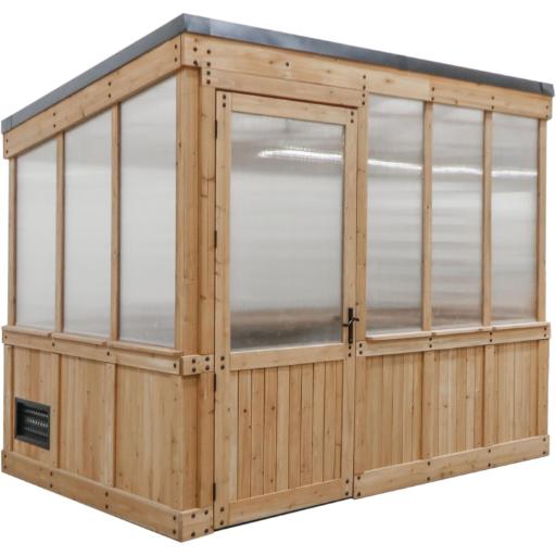 • Wooden greenhouses offer warmth, beauty, and great insulation, especially when paired with thick polycarbonate panels.