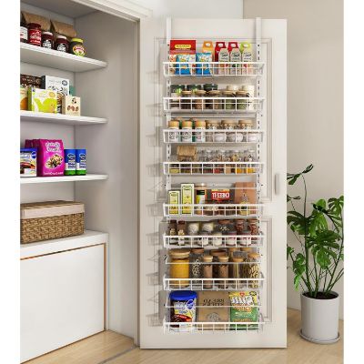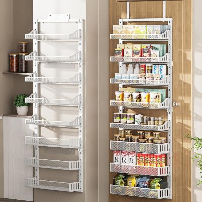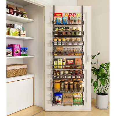 Instead of adding bulky cabinets or sacrificing counter space, these vertical organizers transform unused door space into a structured storage system. From compact 6-tier racks to full-height 9-tier organizers with adjustable baskets, today’s models are built to handle more than just spice jars. They can store canned goods, oils, snacks, cleaning supplies, and even bathroom essentials.