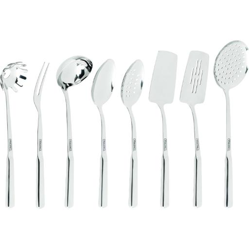 - Set includes 8 essential tools: solid and slotted spoons, spatulas, meat fork, ladle, pasta fork, and skimmer