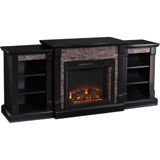Blending rustic textures with traditional charm, the Gallatin Electric Fireplace is more than just a heat source—it’s a design statement. Framed in black with faux river stone detailing, and flanked by two symmetrical bookcases, this unit transforms an ordinary wall into a cozy, functional centerpiece. Whether it’s anchoring a living room or creating ambiance in a reading nook, this piece adds instant character and warmth.