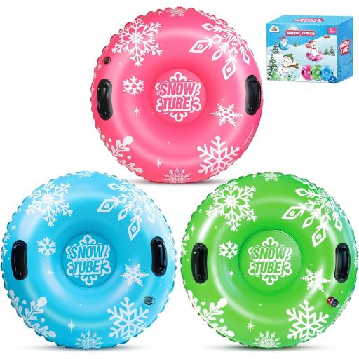 Designed for families looking to make the most of snowy days, the ZMLM 3-pack of inflatable snow tubes delivers lightweight fun with a colorful twist. Each 36-inch sled is made from thickened PVC and features sturdy grab handles, a pull rope, and a quick-inflate triple valve system that gets you ready to ride in no time. The bright snowflake prints add to the festive appeal while the compact design makes these tubes easy to store when the snow melts.